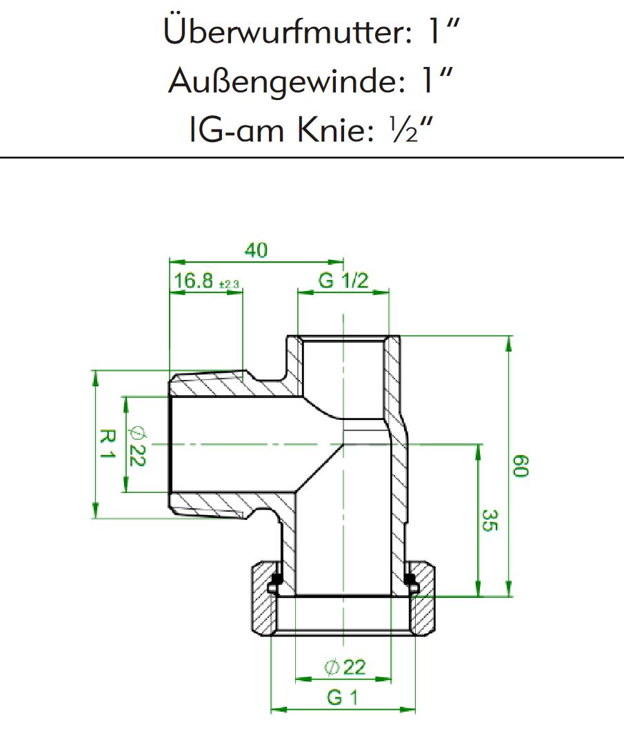 Eckverschraubung mit 1 x Überwurfmutter 1", 1 x 1" AG und 1/2" IG am Knie